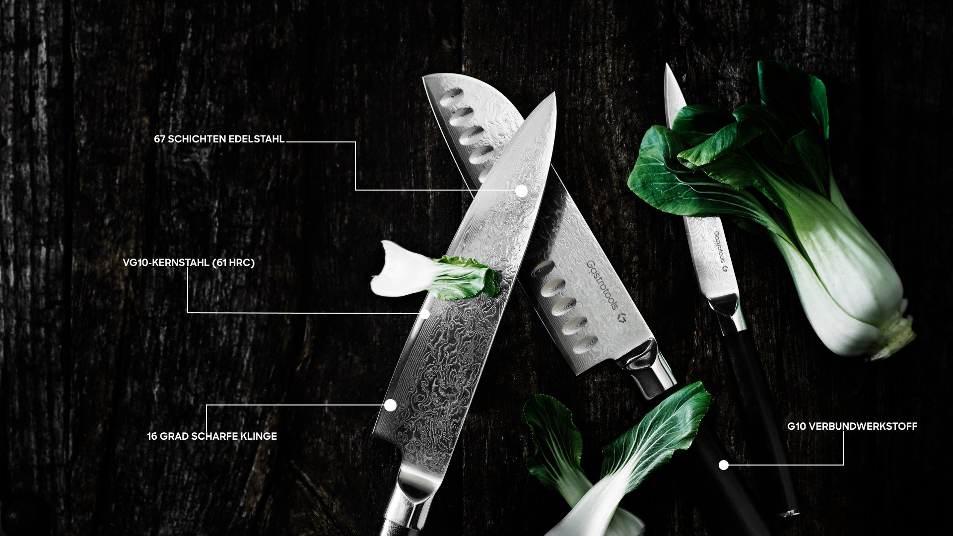 - Stahl: VG10 Kernstahl umgeben von 66 Lagen rostfreiem Stahl (insgesamt 67 Lagen)