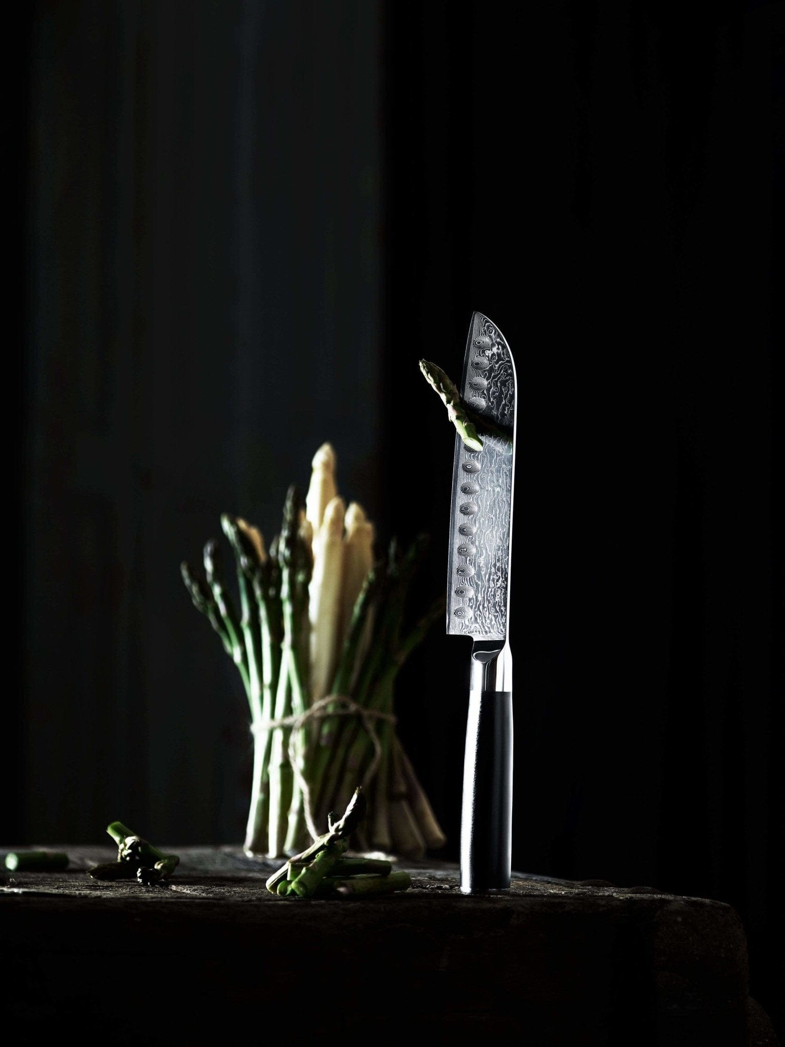 Santoku-Kochmesser für alle Schneidaufgaben – mit Luftschliff und ultrascharfen 67 Stahlschichten für minimale Reibung.
