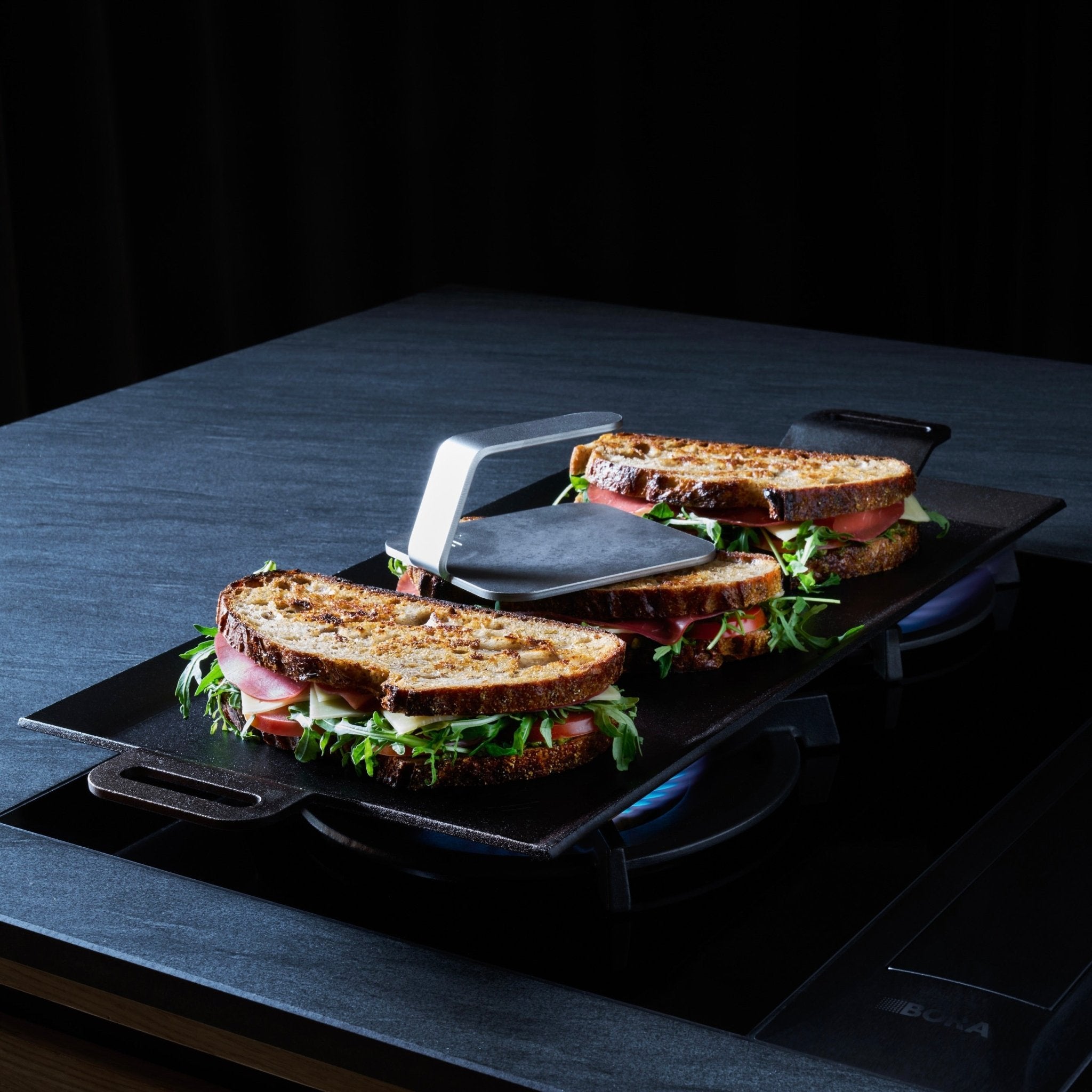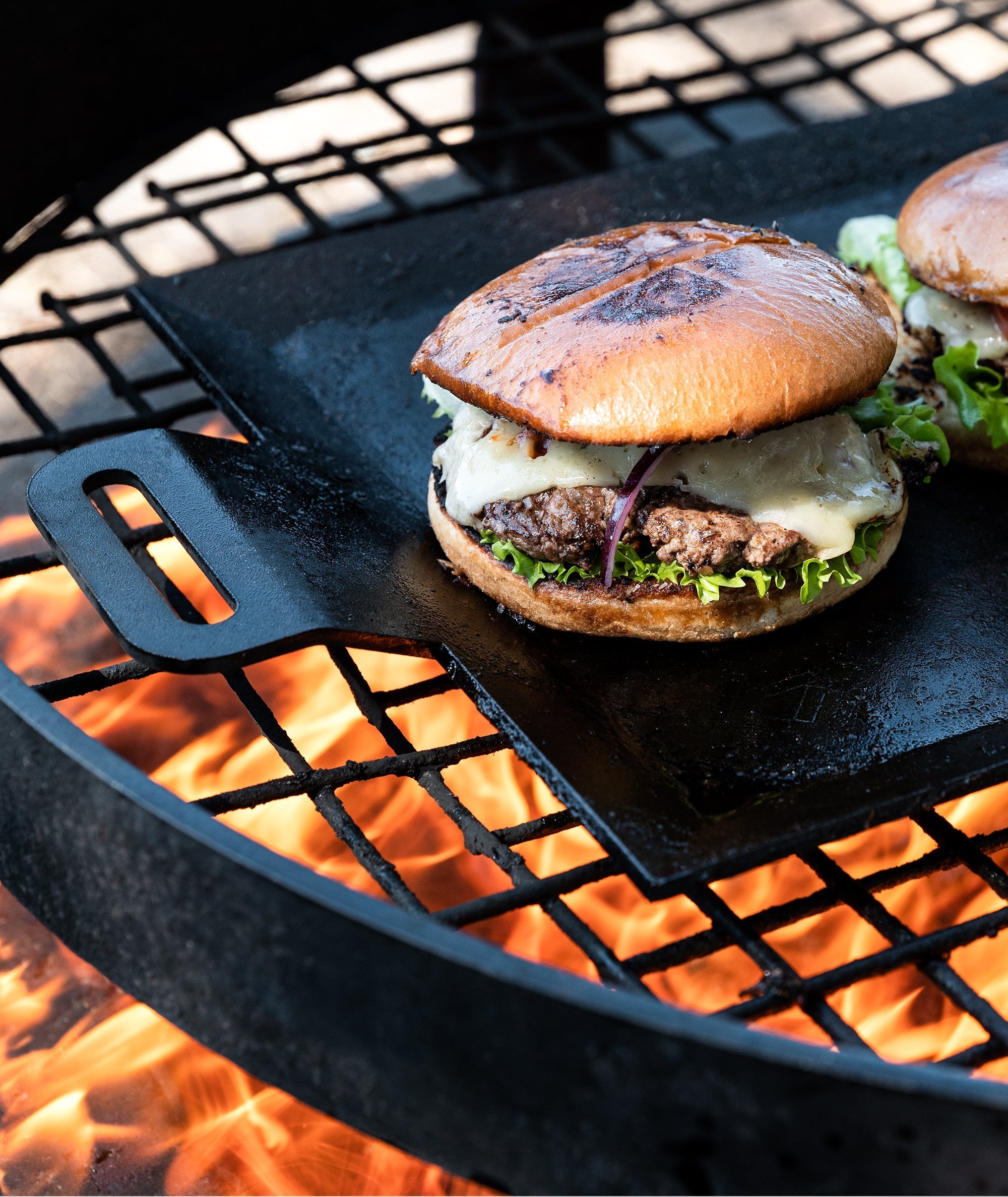Dieses Set besteht aus einer Grillplatte aus Karbonstahl und einem Schmiedestab aus Edelstahl. Die Grillplatte wurde entwickelt, um ein knusprigeres Ergebnis und eine bessere Karamellisierung der Oberfläche von Fleisch und Gemüse zu erzielen. Das bedeutet, dass Sie einen tieferen und intensiveren Geschmack von Steaks bis hin zu gegrilltem Spargel erzielen. Die hochgezogenen Griffe bieten mehr Komfort, wenn Sie die Griddle und den Smasher vom Induktionsherd auf den Grill, das Lagerfeuer oder direkt auf den Tisch zum Servieren heben.