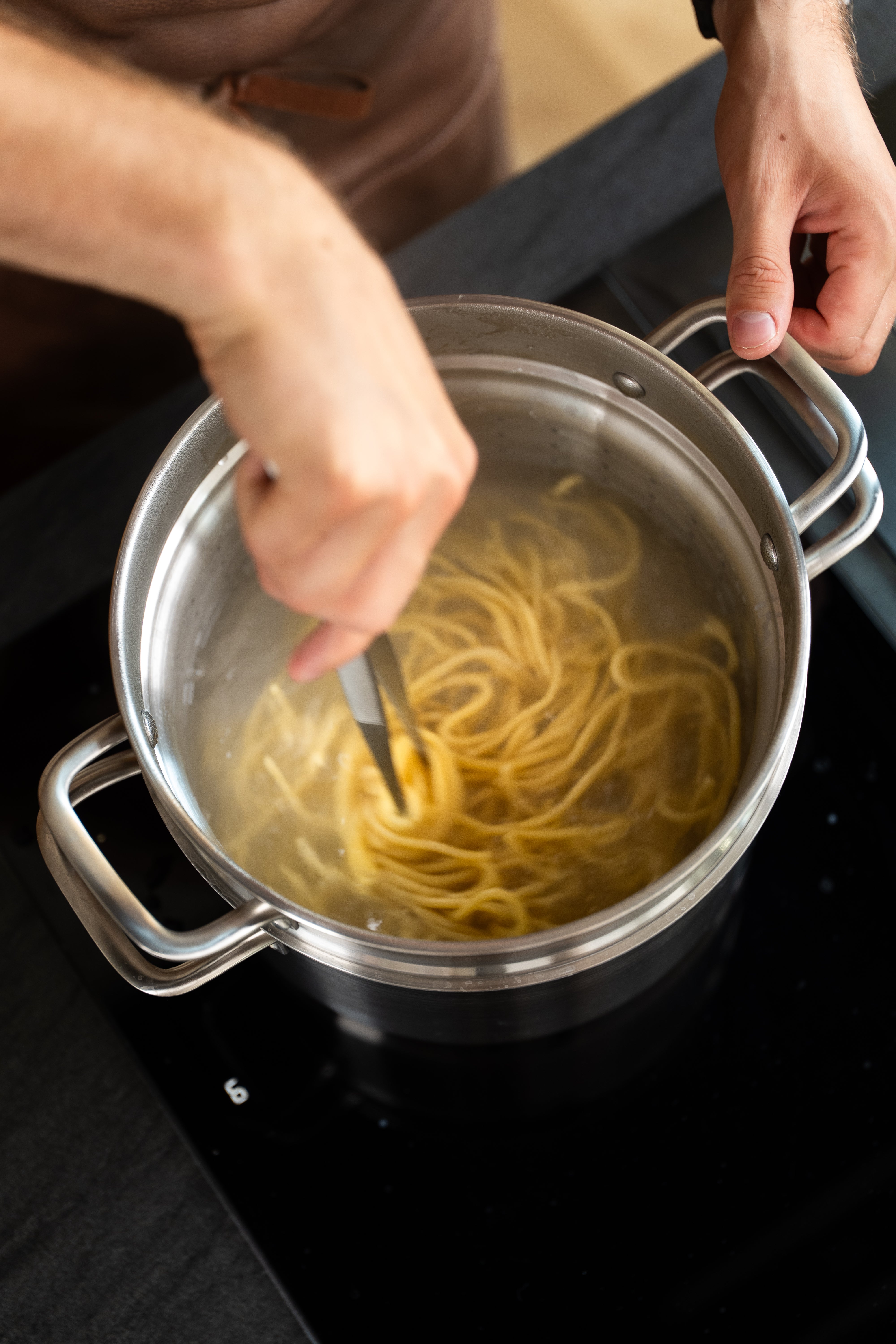 Dank des Aluminiumkerns, der eine hervorragende Wärmeleitfähigkeit aufweist und ein schnelles Erhöhen oder Senken der Temperatur im Topf ermöglicht, erhalten Sie eine effektive Wärmekontrolle. Im Gegensatz zu Kochgeschirr mit Sandwichboden verteilt sich die Wärme natürlich an den Seiten der Pfanne, da die gesamte Pfanne aus 5-lagigem Material besteht – ideal für Gerichte wie Risotto und Schmorgerichte. Der Pasta-Einsatz wurde entwickelt, um perfekte Pasta zu kochen, ohne dass Sie kochendes Nudelwasser aus der Pfanne abgießen müssen, was oft zu Nudeln in der Spüle oder kochendem Wasser auf dem Herd führt. Dank der stabilen Griffe lässt sich der Einsatz leicht in kochendes Wasser absenken, ohne sich zu verbrennen, und ebenso leicht wieder herausheben, wenn das Essen fertig ist. Der Einsatz eignet sich jedoch nicht nur für Pasta: Verwenden Sie ihn zum Blanchieren von Spargel, zum Kochen von Kartoffeln oder zum Kochen großer Mengen Eier.