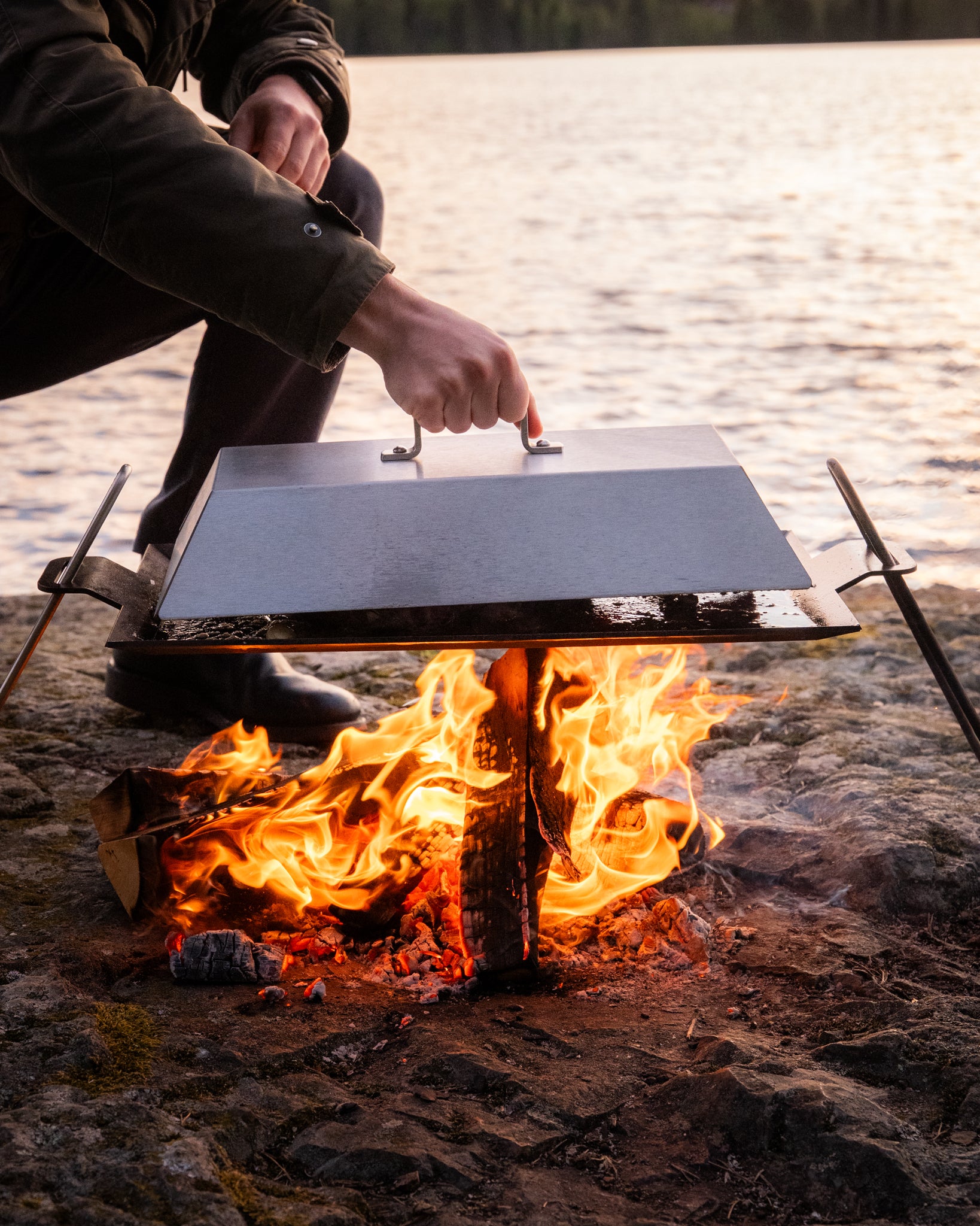 Der Deckel wird im Herzen von Småland hergestellt, genau wie die Grillplatte, wo man über 100 Jahre Erfahrung in der Handwerkskunst hat. Er wird aus hochwertigem Edelstahl geschnitten und gebogen, dann wird der Griff mit Nieten befestigt. Der Deckel ist schwer genug, um sicher auf der Grillplatte zu stehen, selbst wenn Sie an einem windigen Tag nach draußen zum Kochen gegangen sind. Das einfache und funktionale Design sorgt für eine solide Konstruktion, die jahrelang hält.