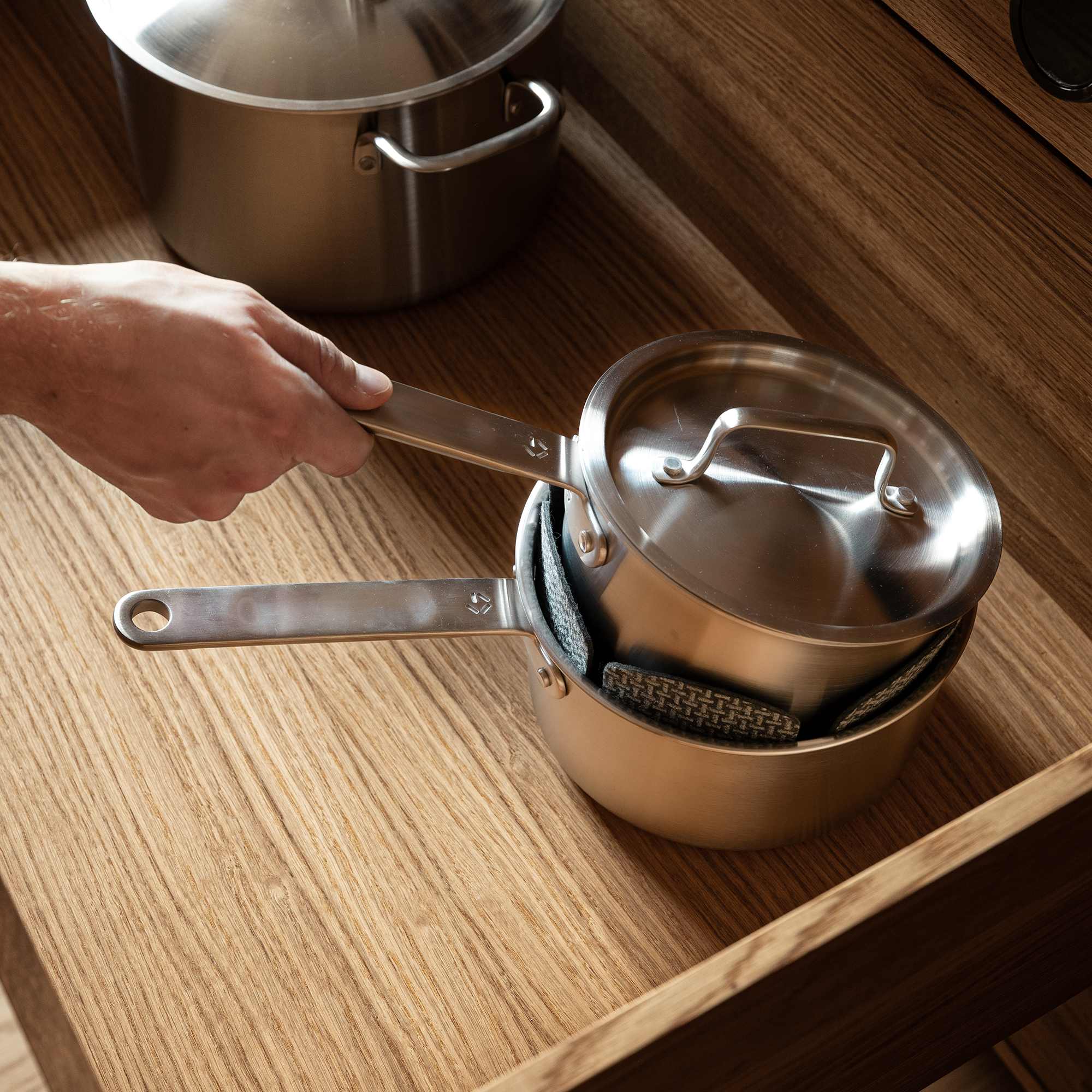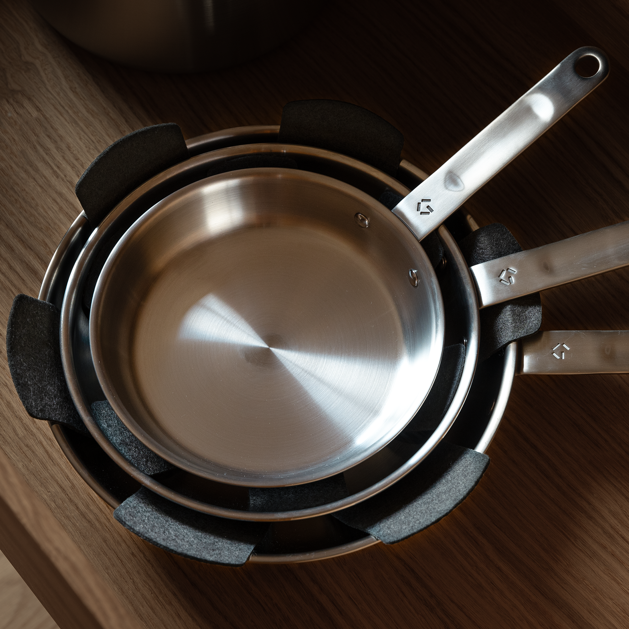 Pfannenschoner sind das perfekte Accessoire für deine Pfannen, wenn du sie gestapelt aufbewahrst. Das Design ist schlank und funktional: Dank der Form der Schützer sitzen sie am Boden der Pfannen und lassen sich leicht darauf stapeln - und du kannst sie sogar in Töpfen verwenden.
