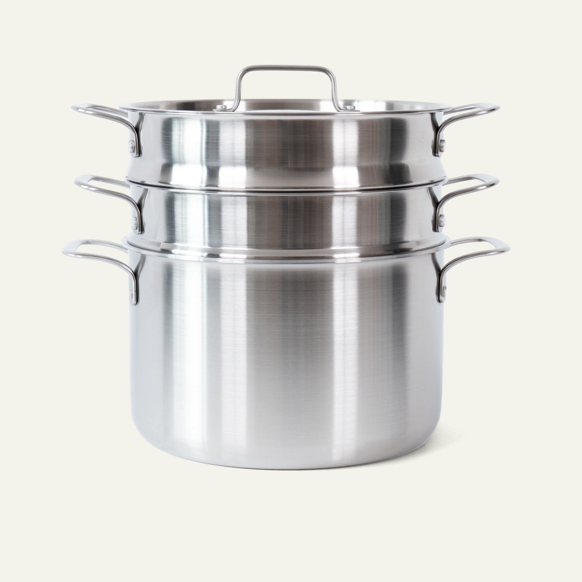 Der Topf sorgt dank seiner fünfschichtigen Konstruktion für eine unglaublich gleichmäßige Wärmeverteilung, im Gegensatz zu den drei Schichten, die normalerweise bei Edelstahlkochgeschirr zu finden sind. So entstehen keine heißen Stellen am Boden des Topfes, die zu angebrannten Speisen, ungleichmäßiger Garung und separierten Soßen führen können.