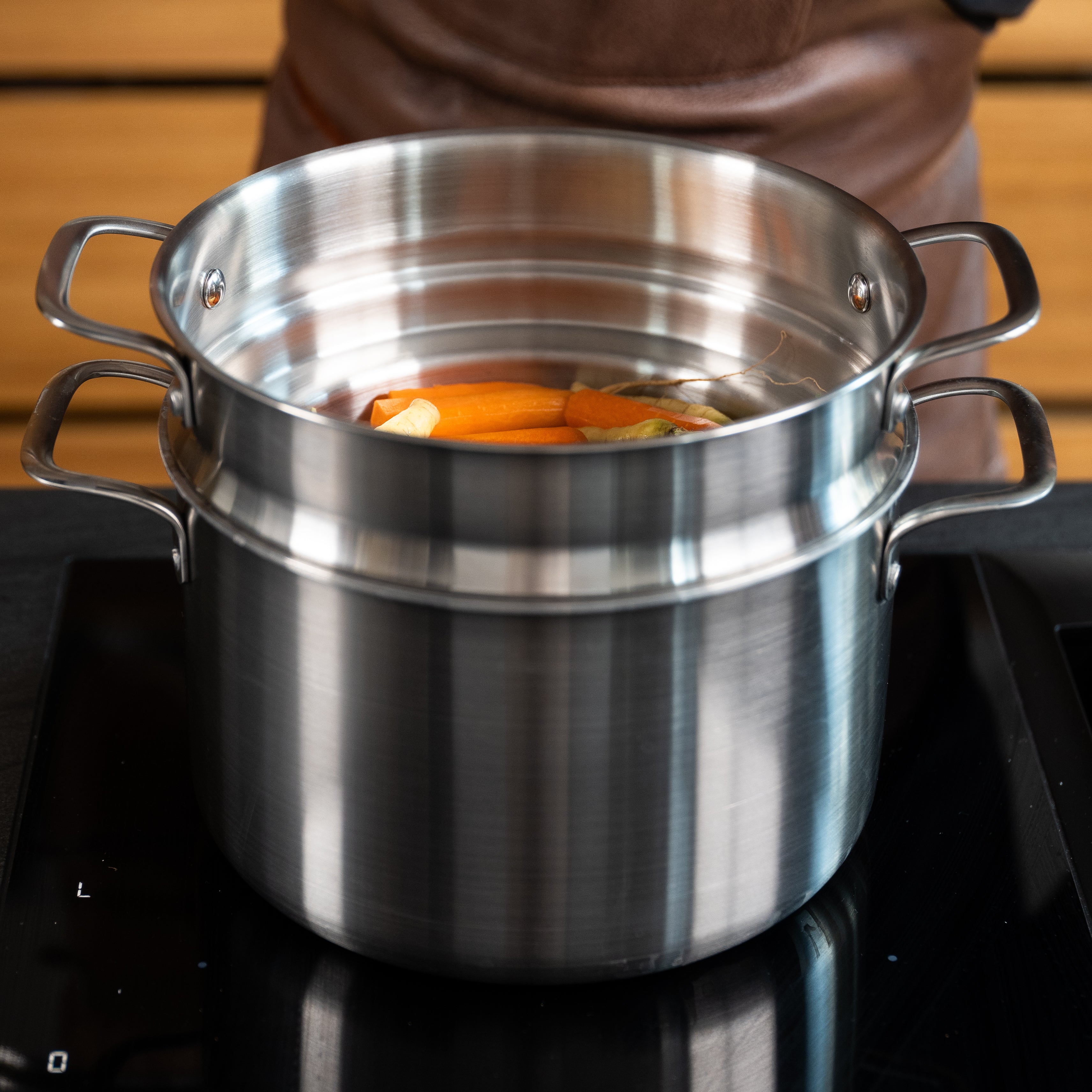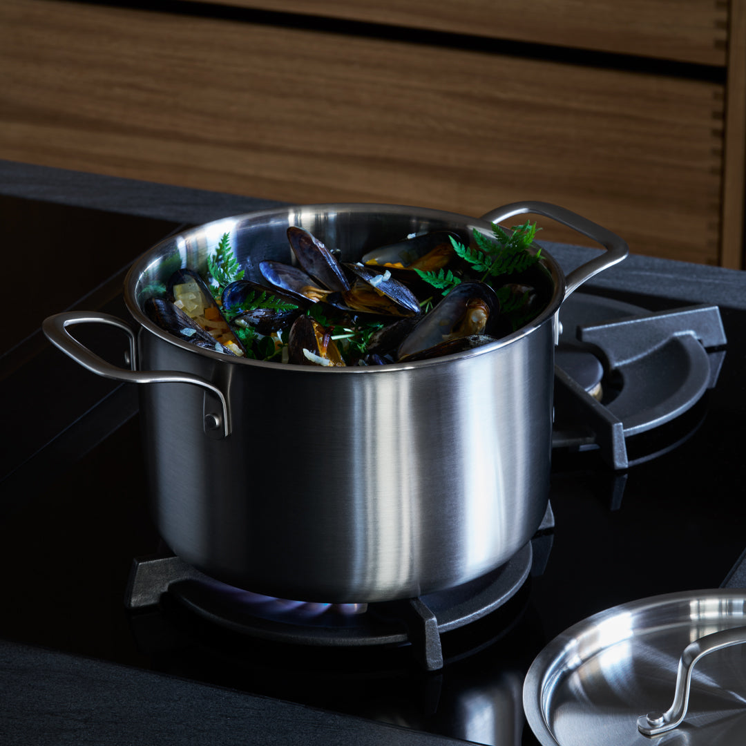 Dank des Aluminiumkerns, der über eine hervorragende Wärmeleitfähigkeit verfügt und ein schnelles Erhöhen oder Senken der Temperatur im Topf ermöglicht, erhalten Sie eine effektive Wärmekontrolle. Im Gegensatz zu Kochgeschirr mit einem aufgesetzten Sandwich-Boden verteilt sich die Wärme natürlich an den Seiten des Topfes, da der gesamte Topf aus 5-Lagen-Material besteht – ideal für Gerichte wie Risotto und Schmorgerichte. Ein Pasta- und Dämpfeinsatz ist die ideale Ergänzung für Ihren 5-lagigen Topf. Dank der stabilen Griffe lassen sich die Einsätze leicht in kochendes Wasser oder einen dampfenden Topf absenken, ohne sich zu verbrennen, und ebenso leicht wieder herausnehmen, wenn das Essen fertig ist. Und wenn Sie den Inhalt mit kaltem Wasser abspülen müssen, um den Garvorgang zu stoppen, können Sie den Einsatz einfach über den kalten Wasserhahn halten. Perfekt für Pasta, Knödel oder saftigen Fisch. Alle Teile werden in Italien von unseren Freunden und Partnern Franco, Mario und Eliano handgefertigt, die jedes Produkt in ihrer Familienwerkstatt mit über 130 Jahren Erfahrung sorgfältig herstellen. Das ist dänisches Design, italienische Handwerkskunst und Ihre Garantie für erstklassige Qualität.