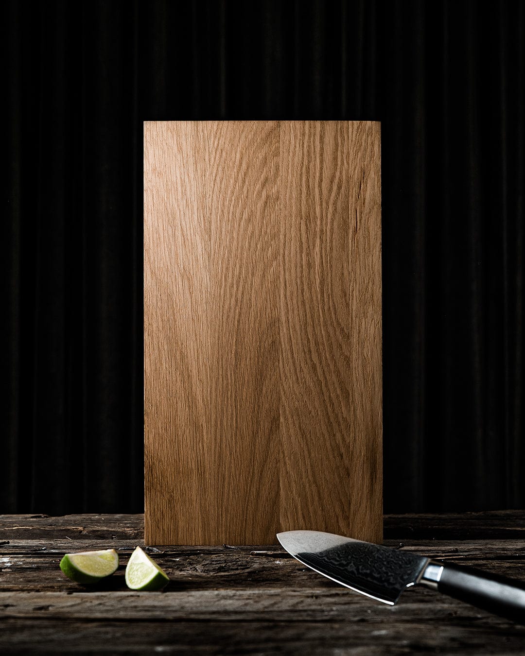 Elegantes Schneidebrett aus massivem, FSC-zertifiziertem Eichenholz, das aus französischen Wäldern stammt – hergestellt von einem Familienunternehmen südlich von Lyon.