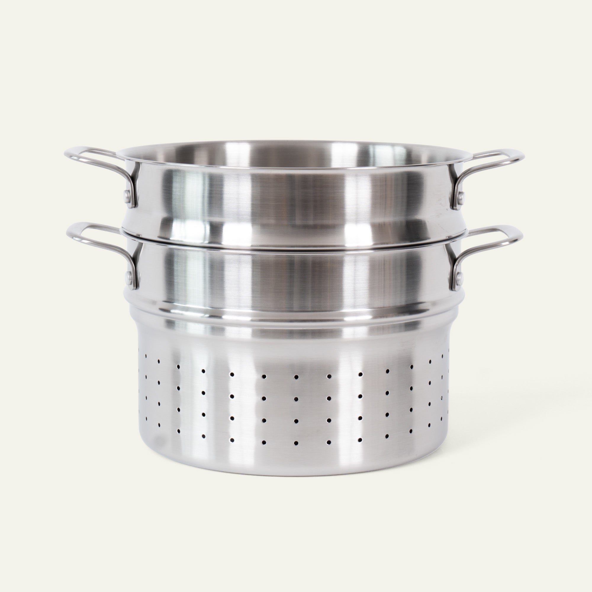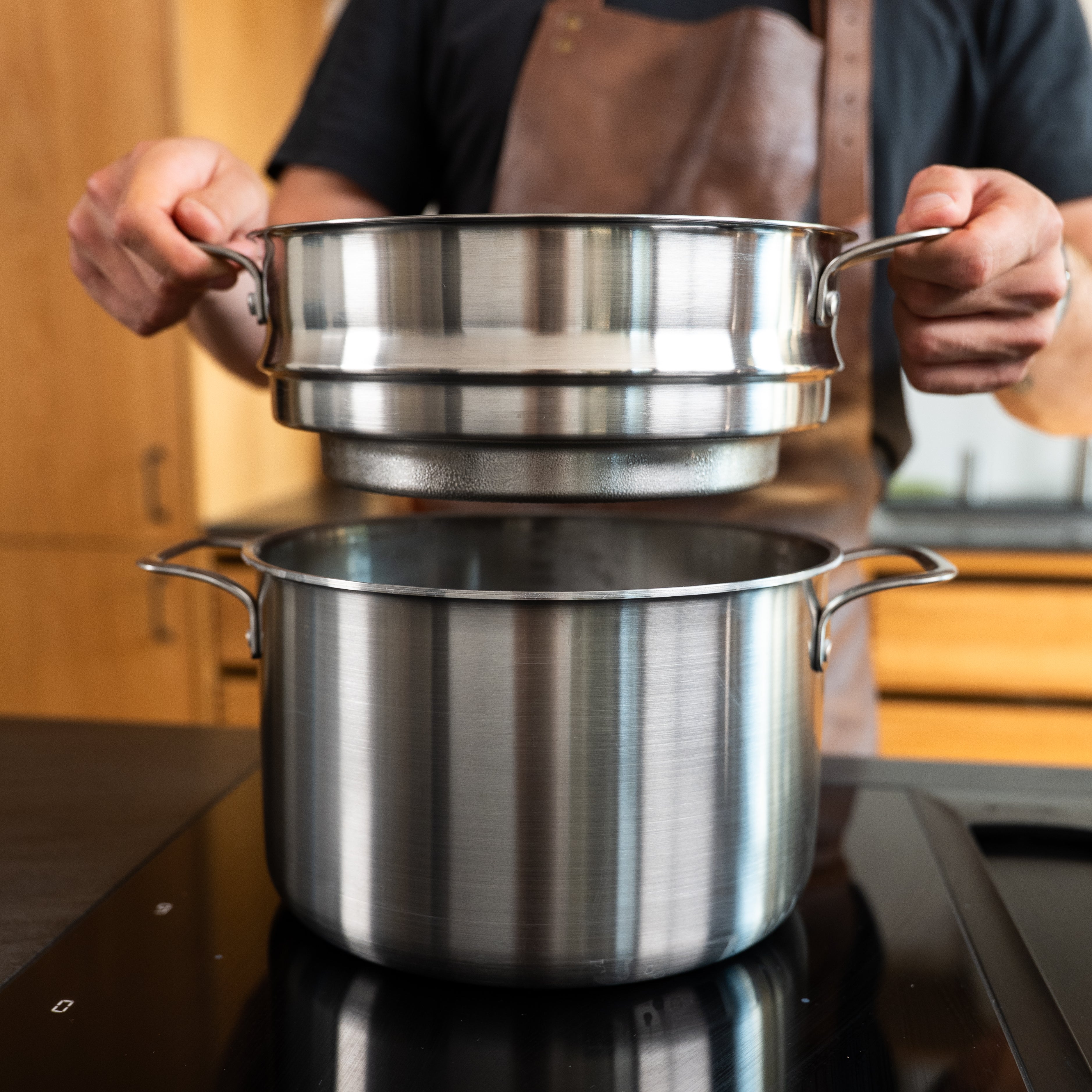 Ein Nudel- und Dämpfeinsatz ist die ideale Ergänzung für Ihren 5-lagigen Topf. Dank der stabilen Griffe lassen sich die Einsätze leicht in kochendes Wasser oder einen Dampfkochtopf einsetzen, ohne dass Sie sich verbrennen, und ebenso leicht wieder herausnehmen, wenn das Essen fertig ist. Und wenn Sie den Inhalt mit kaltem Wasser abspülen müssen, um den Garvorgang zu stoppen, können Sie den Einsatz einfach über den kalten Wasserhahn halten. Beide Einsätze werden in Italien von demselben Familienunternehmen hergestellt, das auch unser 5-lagiges Kochgeschirr produziert.