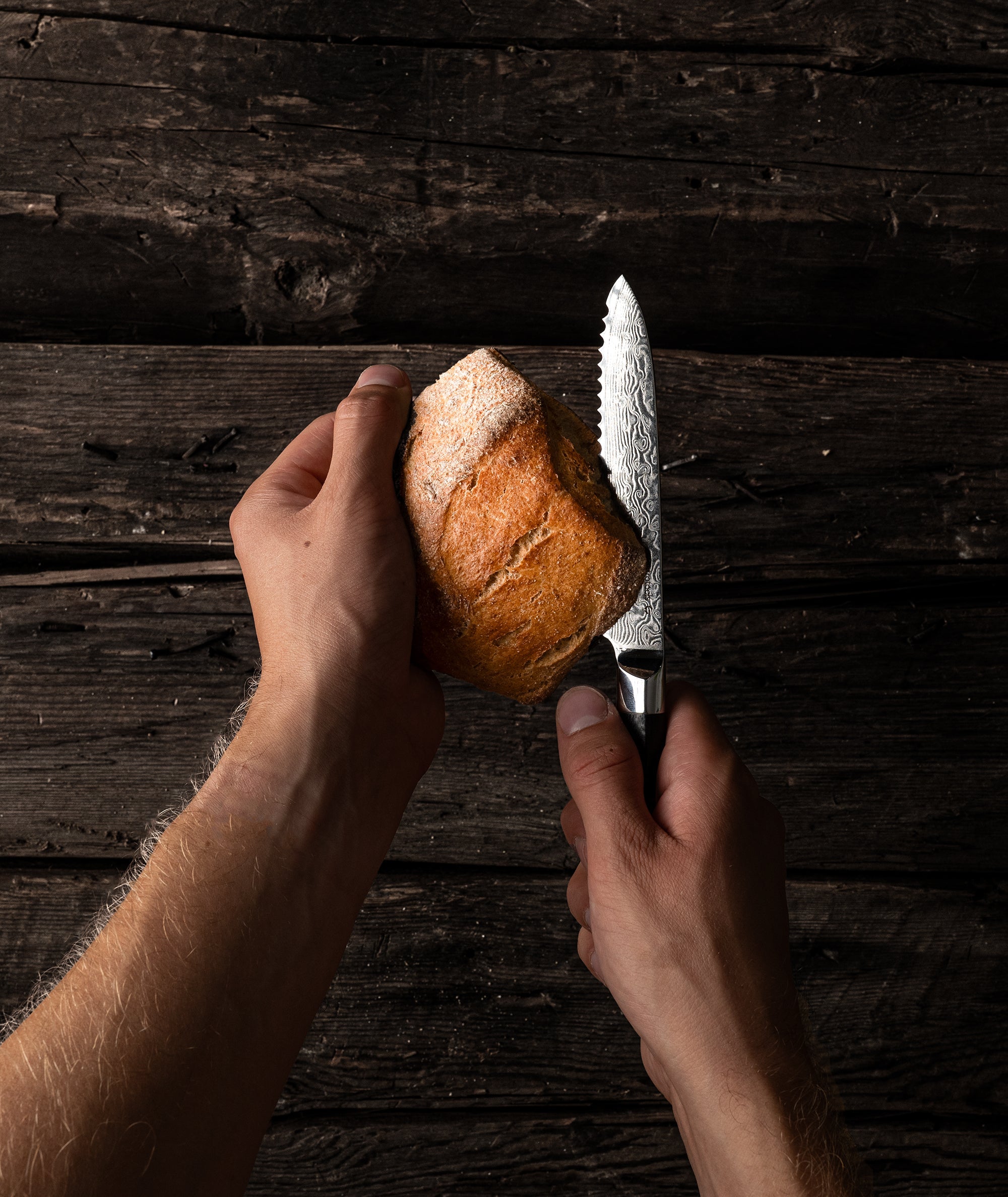 Entdecken Sie die unvergleichliche Vielseitigkeit unseres gezackten Universalmessers. Perfekt für eine breite Palette von kulinarischen Aufgaben, schneidet es mühelos durch harte Außenflächen und bewahrt gleichzeitig die Integrität weicher Innenbereiche.