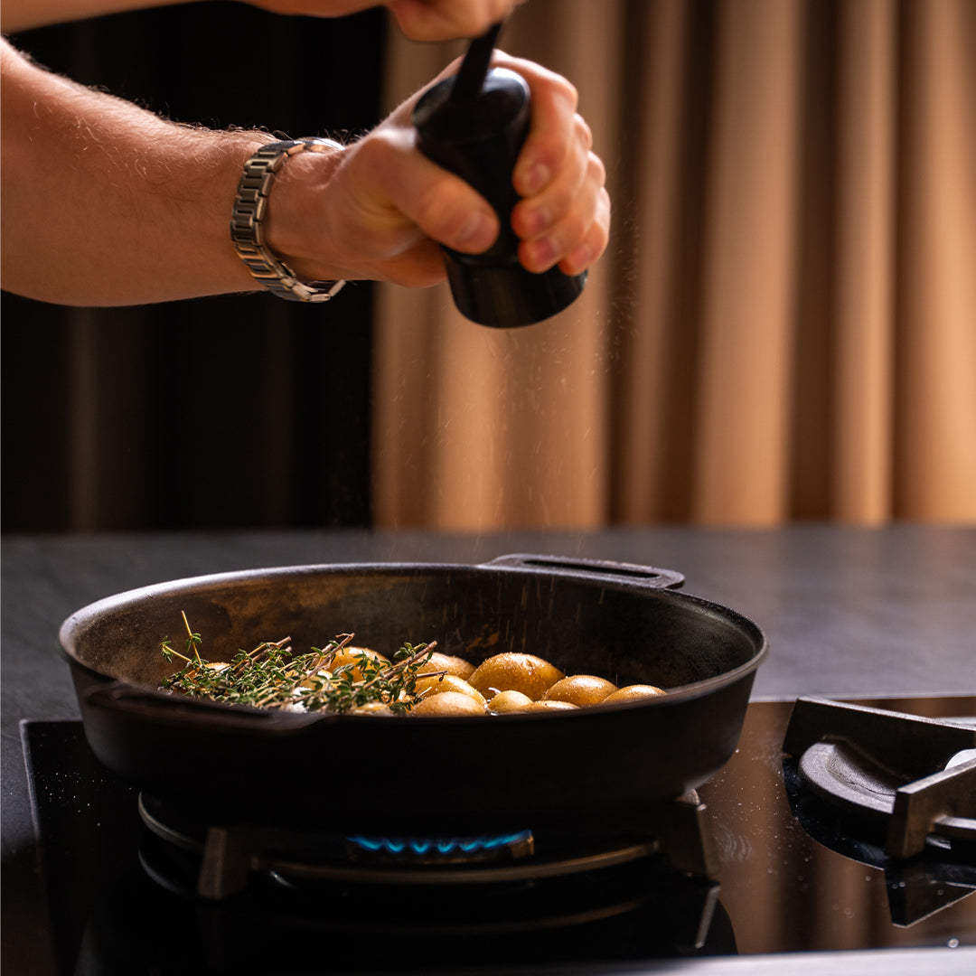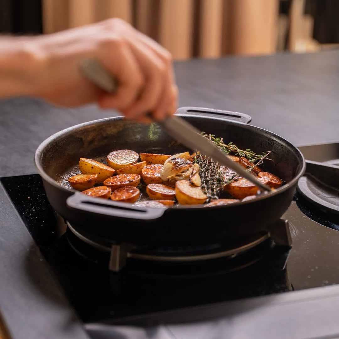 With its material and design, you get an incredibly multifunctional kitchen tool: use the frying pan on the stove for everyday cooking, whether you have induction, gas or ceramic hobs. Take the frying pan to the barbecue in the summer or put it on a fire stand for cooking over an open fire. And you can even use it in the oven as a pie dish for both savoury and sweet cuisine.
