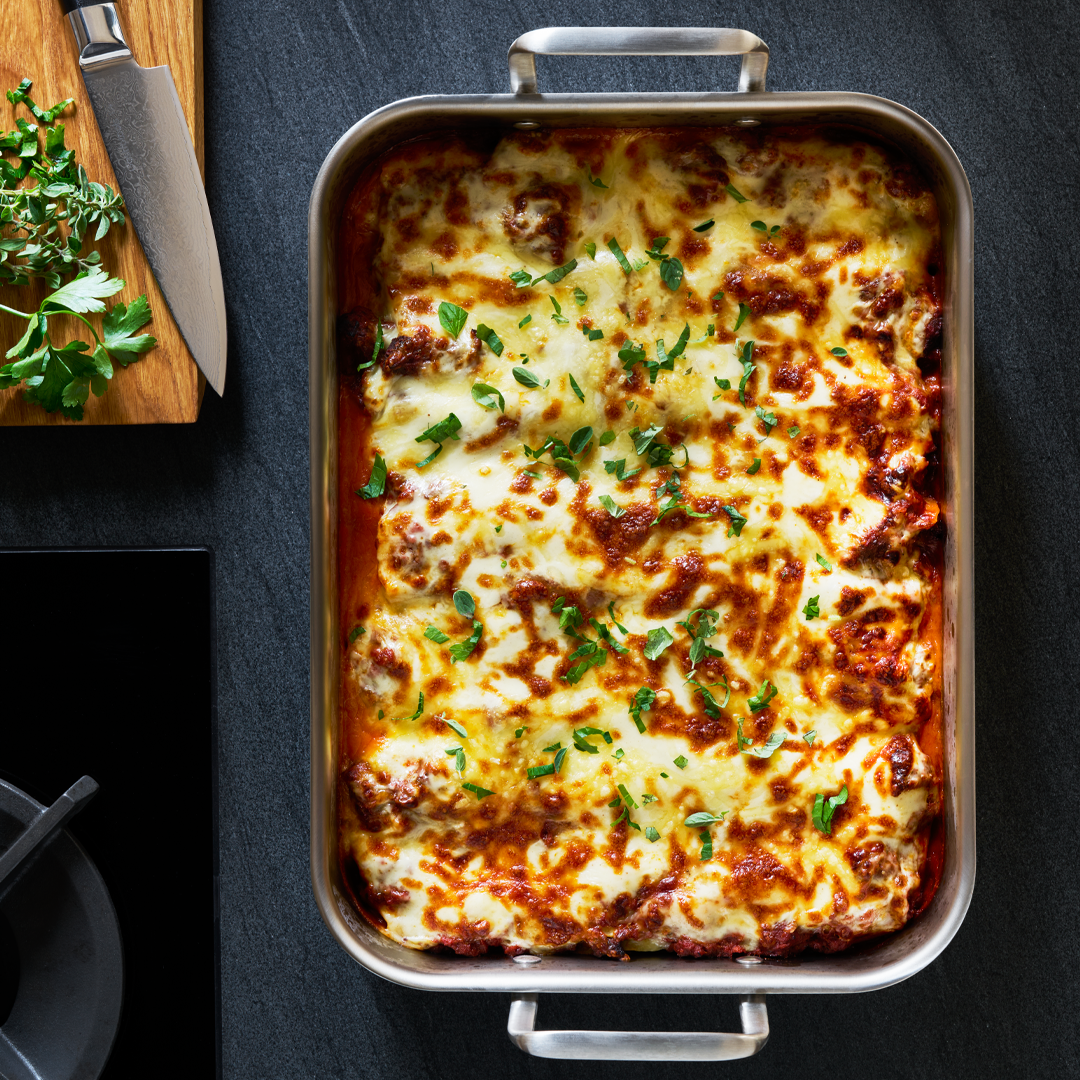 The roasting pan ensures even and rapid heat distribution thanks to its five-layer construction, compared to the typical three-layer designs of most stainless steel cookware. Uniform and efficient heat conduction is essential, whether you're making lasagna, baking focaccia, or roasting root vegetables in the oven.
